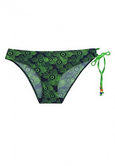 Отличное бикини для яркого пляжного лета! Своеобразие этнического принта подчеркивает интересное цветовое сочетание темно-синего и ярко-зеленого, контрастные бусины-аксессуары и кокетливые завязки.