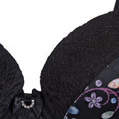 Невероятно благородное и ультрамодное сочетание филигранного кружева и нежного атласа, расписанного ярким узором калейдоскопического характера. Атласный бантик с кристаллами в качестве аксессуара.