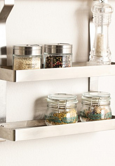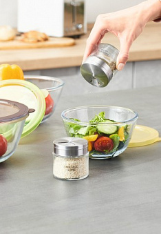 Емкость для соли и специй выполнена из стекла. Стальная крышка с отверстиями разного диаметра.