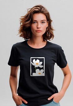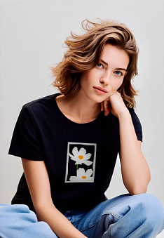 Футболка женская с принтом «Ромашки» цвет черный Фаберлик артикул - 895178-895183, весом 129 гр. цена - 1199 руб., выбрав из 4 размеров (от XS (42) до XXL (52)), с доставкой в пункты выдачи Faberlic, постаматы Рickpoint и отделения почты России