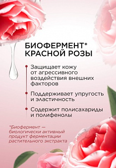 Биофермент* красной розы защищает кожу от агрессивного воздействия внешних факторов, поддерживает ее упругость и эластичность. Содержит полисахариды и полифенолы: рутин, галловую кислоту и кверцетин.