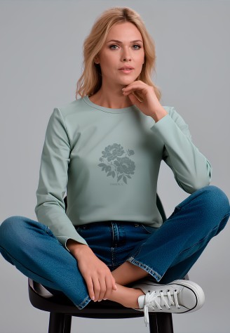 Лонгслив с флоральным принтом «Пионы», серая мята Фаберлик артикул - СТ_10241, весом 156 гр. цена - 1499 руб., выбрав из 4 размеров (от XS (42) до XXL (52)), с доставкой в пункты выдачи Faberlic, постаматы Рickpoint и отделения почты России