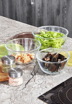 Миска из термостойкого стекла с крышкой отлично подойдет для приготовления и подачи салатов, для запекания горячих блюд в духовке (без крышки!), микроволновой печи, для замораживания продуктов.