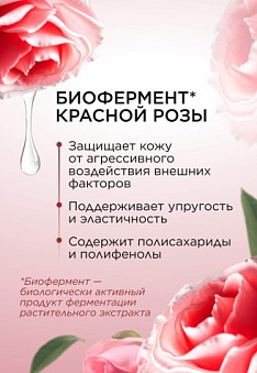 Биофермент* красной розы защищает кожу от агрессивного воздействия внешних факторов, поддерживает ее упругость и эластичность. Содержит полисахариды и полифенолы: рутин, галловую кислоту и кверцетин.
