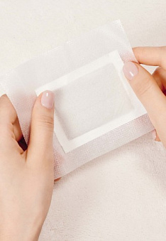 1. Откройте упаковку. Снимите защитный бумажный слой вдоль линии разреза. Наклейте пакетик с порошком в центр патча.