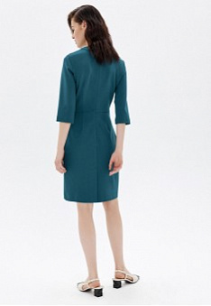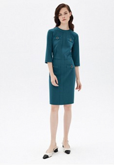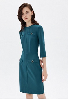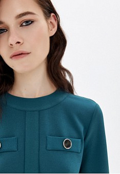 - Приталенный силуэт, круглый вырез, застёжка на потайную молнию сзади, рукава 3/4, декоративные карманы с пуговицами.