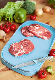 - Специальные зубцы и бортик фиксируют продукт. Его удобно разделывать или шинковать – кусочки не будут падать.