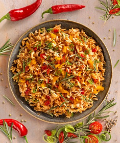 рис длиннозерный, овощи и зелень сушеные (тыква молотая, томаты, паприка, лук зеленый, чеснок, базилик), специи молотые (паприка копченая, перец черный молотый, кориандр, кардамон молотый), бамбуковая клетчатка.