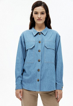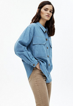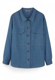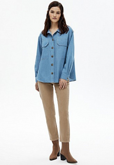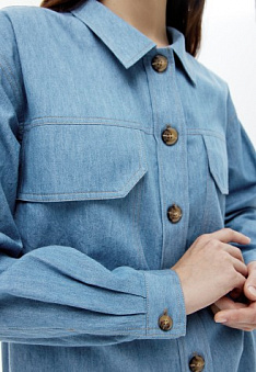 - Свободный силуэт, застежка на пуговицы, отложной воротник на стойке, накладное карманы с клапанами, длинные рукава с манжетами и застежкой на пуговицы.