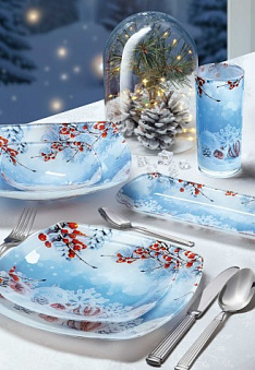 Коллекция «Морозные узоры» – все, что нужно для праздничной сервировки стола! Изящные снежинки, переливаются на нежно-голубом фоне, словно иней. Яркие всплески красной рябины напоминают о долгожданной прогулке по зимнему лесу, а заснеженные елочные шары создают сказочное ощущение праздника. Почувствуйте дыхание зимы и приближение чуда!