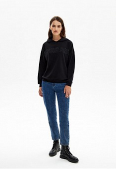 Однотонная, мягкая и уютная толстовка из футера прослужит не один сезон. Прямой силуэт идеально подойдет любой фигуре, классический черный впишется в любой стиль и случай, а стразы добавят яркий и гламурный акцент в аутфит.