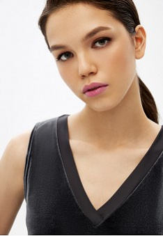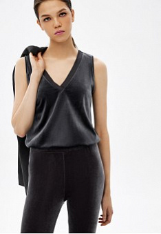 Топ на широких бретелях из изысканного струящегося велюра будет гармонично смотреться как в составе офисного образа, так и вечернего.