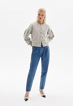 - Прямой силуэт, круглый вырез, застежка на пуговицы, длинные объемные рукава с манжетами, без подкладки.