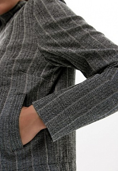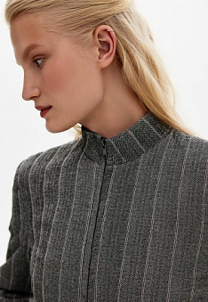 - Прямой силуэт, воротник-стойка, застежка на потайную молнию, длинные рукава, прорезные карманы, подкладка.