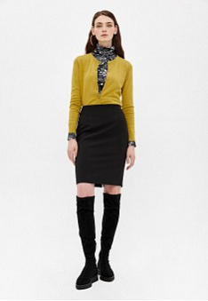 - Прилегающий силуэт, высокий ворот, длинные рукава.