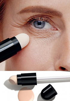 Точечно нанесите средство на необходимые участки лица, растушуйте спонжем, расположенным внутри крышки.