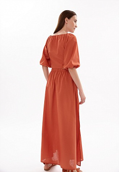 - Платье с объемными рукавами, цвет терракотовый, его цена - 1199 Р, равнозначная замена