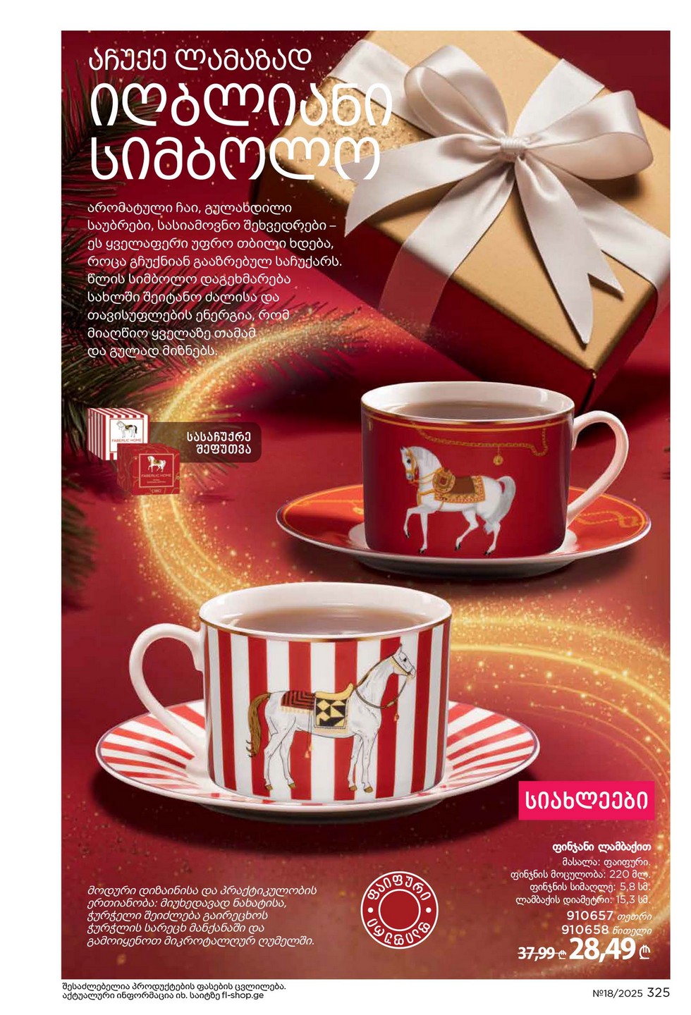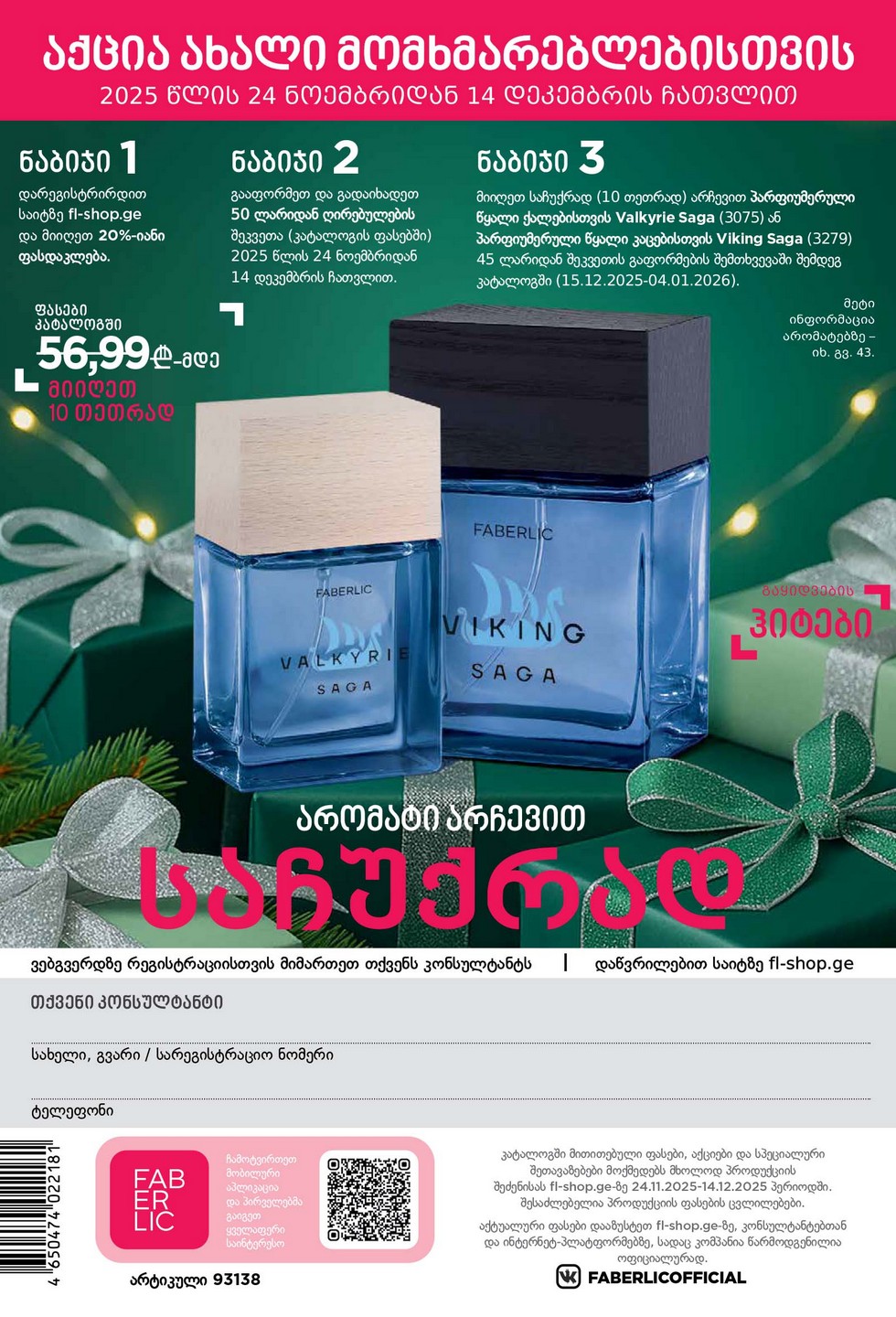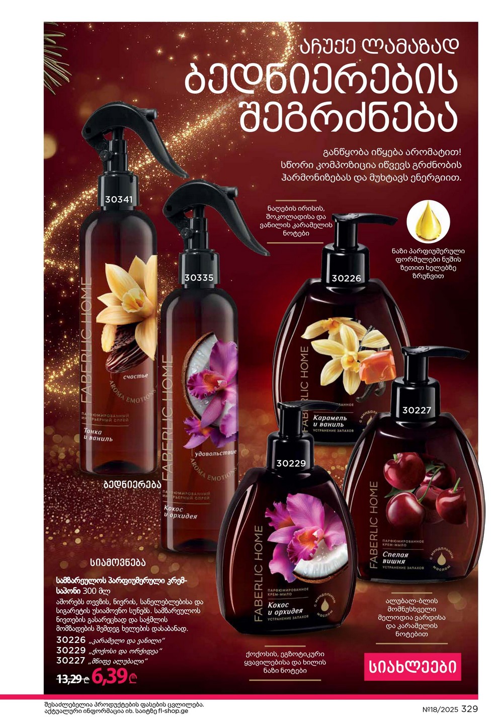 გაეცანით faberlik Georgia 18 2025 კატალოგს ონლაინ, რეგისტრაციისა და რეკლამის გარეშე, ფასები მითითებულია ლარში, მოქმედებს 3 კვირის განმავლობაში 2025 წლის 24 ნოემბრიდან 2025 წლის 14 დეკემბრამდე. ჩვენს ვებ-გვერდზე 18 Faberlic კატალოგის ნახვისას ყურადღება მიაქციეთ მომგებიან აქციებს, საჩუქრებს დამწყებთათვის და ახალ პროდუქტებს ამ კატალოგში, ისინი მოთავსებულია ცალკეულ ბლოკებში ნახვის მარტივად.