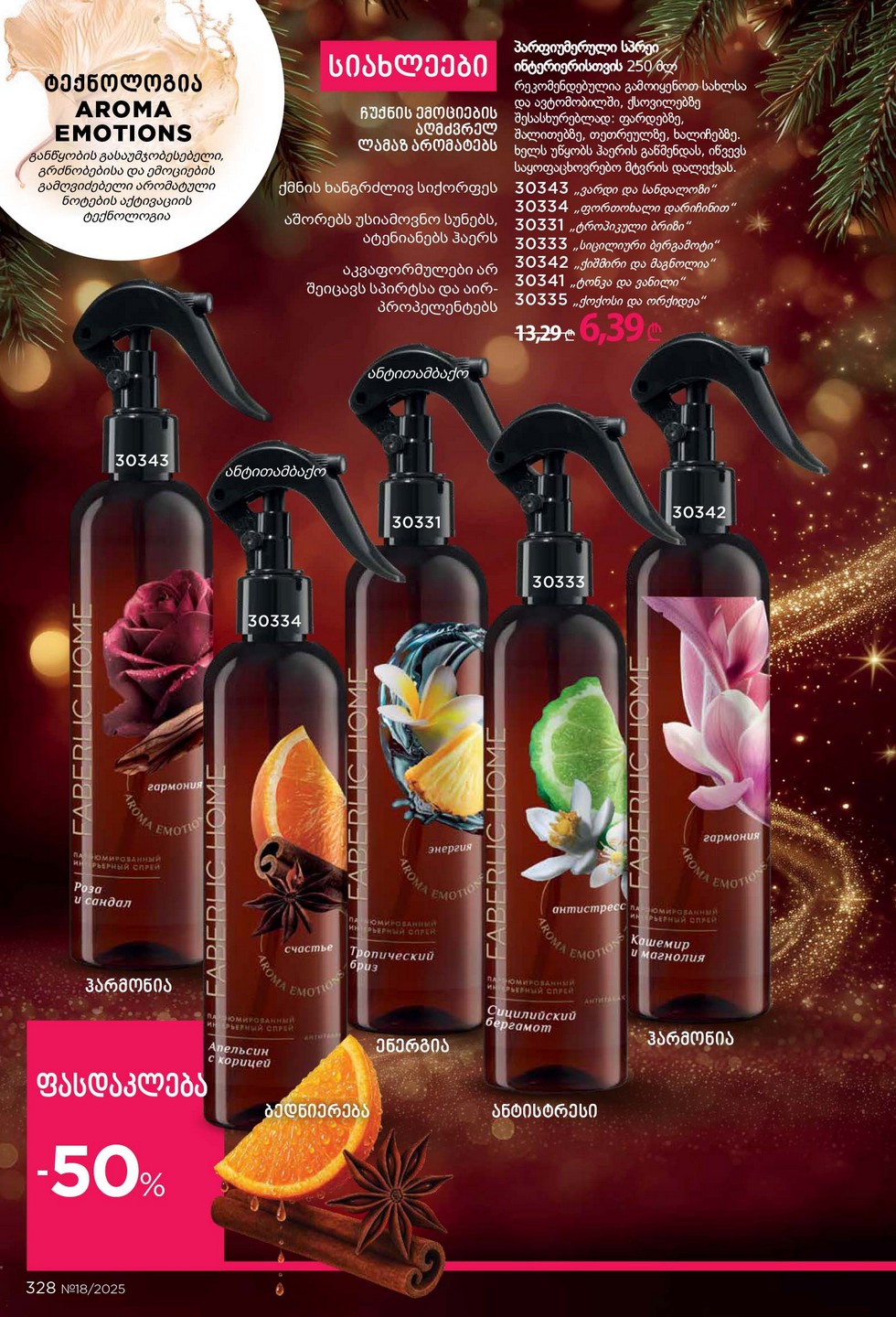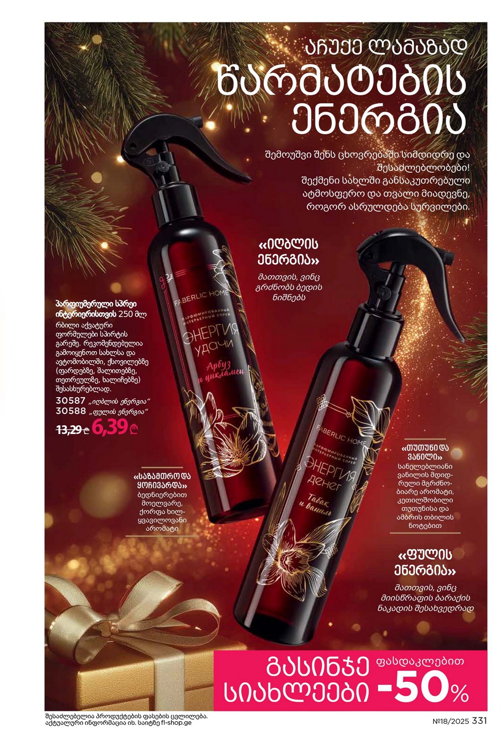 - Любой аромат 30 мл со скидкой 45% всего за 14,39 ₾ при покупке по каталогу на сумму от 18,99 ₾. Товары-участники: 3054, 3062, 3201, 3270, 3273, 3274, 3333, 3369, 3768, 3911.