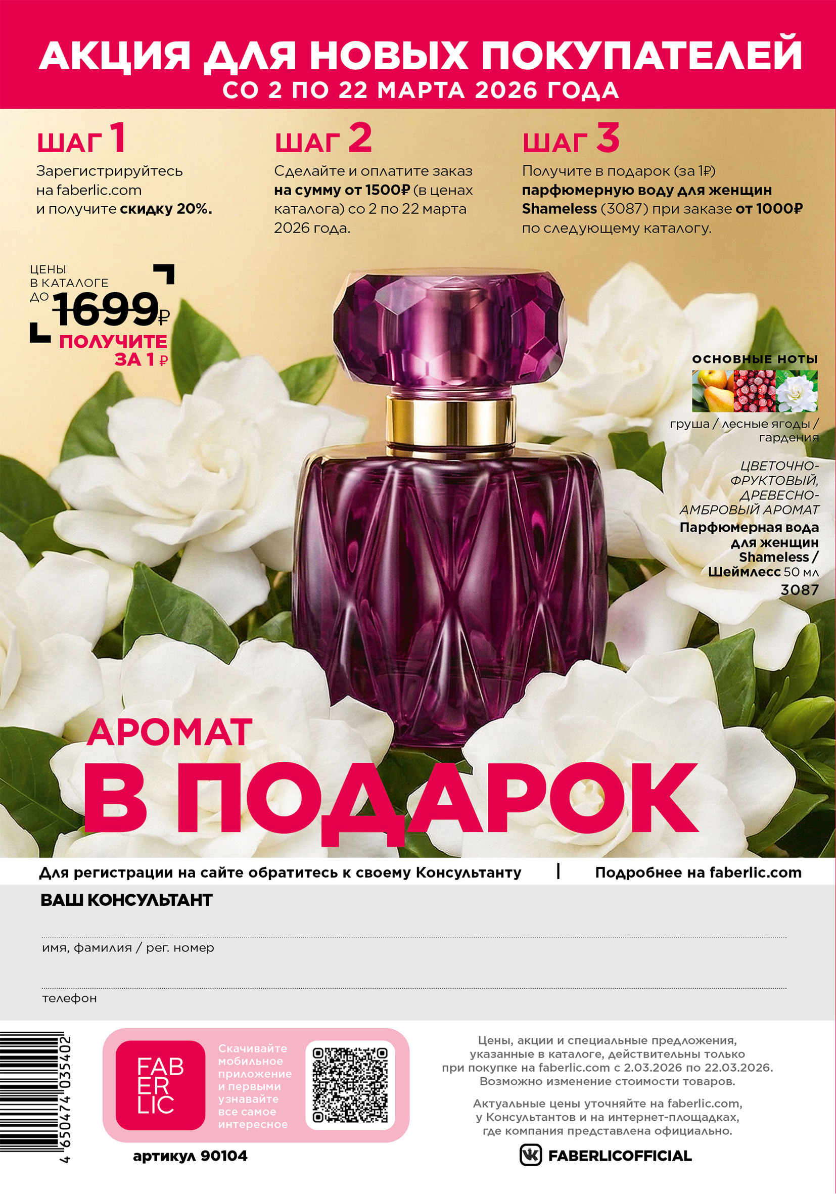Всем, кто зарегистрируется в Faberlic с 2 по 22 марта 2026 года и совершит покупку в периоде №4/2026, дарим аромат при заказе по следующему каталогу с 23 марта по 12 апреля 2026 года.