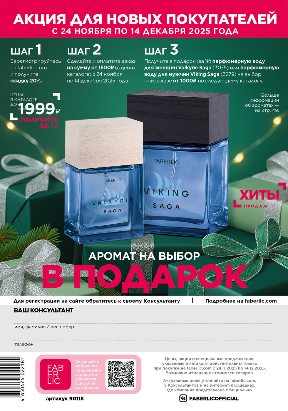Всем, кто зарегистрируется в Faberlic с 24 ноября по 14 декабря 2025 года и совершит покупку в периоде №18/2025, дарим аромат на выбор при заказе по следующему каталогу с 15 декабря по 4 января 2026 года.