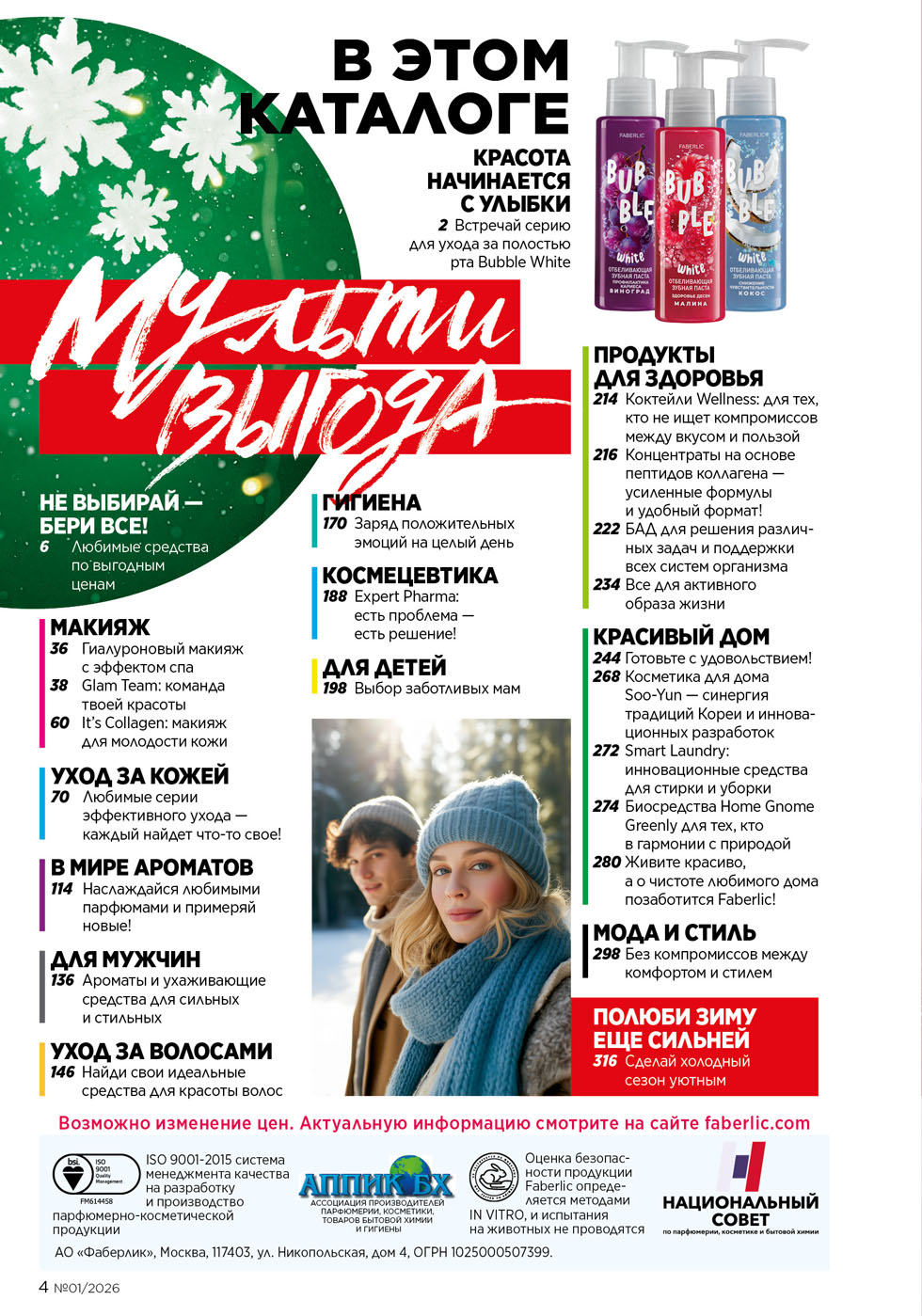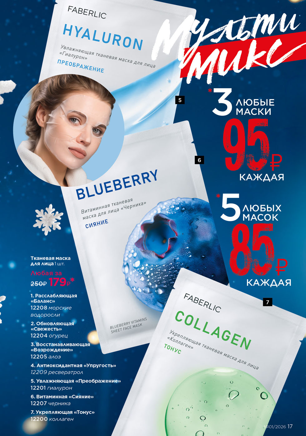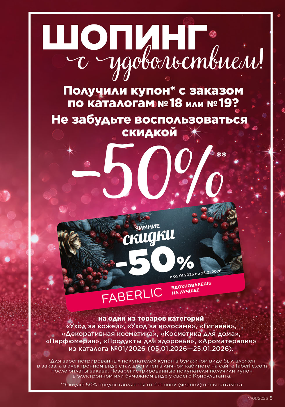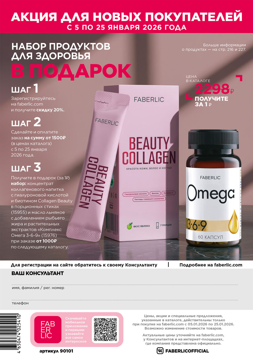 Посмотри каталог фаберлик Туркменистан 1 2026 года в режиме онлайн, без регистрации и рекламы, цены указаны в ман., действует 3 недели с 5 января 2026 по 25 января 2026. При просмотре 1 каталога Faberlic на нашем сайте, обрати внимание на выгодные акции, подарки для новичков и новинки продукции данного каталога, они вынесены в отдельные блоки для удобства просмотра. Тип: новый (следующий) каталог